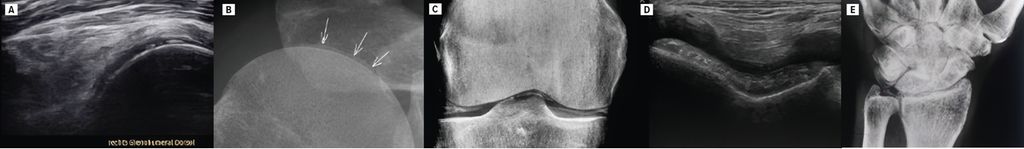 Abb. 1: Röntgen und Ultraschallbilder von Patienten mit Kalziumpyrophosphaterkrankung als wichtigste Differenzialdiagnose der Polymyalgia rheumatica. Verkalkungen im hyalinen Knorpel des Humeruskopfs in Ultraschall (A) und Röntgen (B); Verkalkungen im hyalinen Knorpel des Femurs sowie im Faserknorpel des Meniskus im Röntgen (C) und im hyalinen Knorpel des Femurs im Ultraschall (D); Verkalkungen im Discus triangularis («triangular fibrocartilage complex», TFCC) im Röntgen (E)