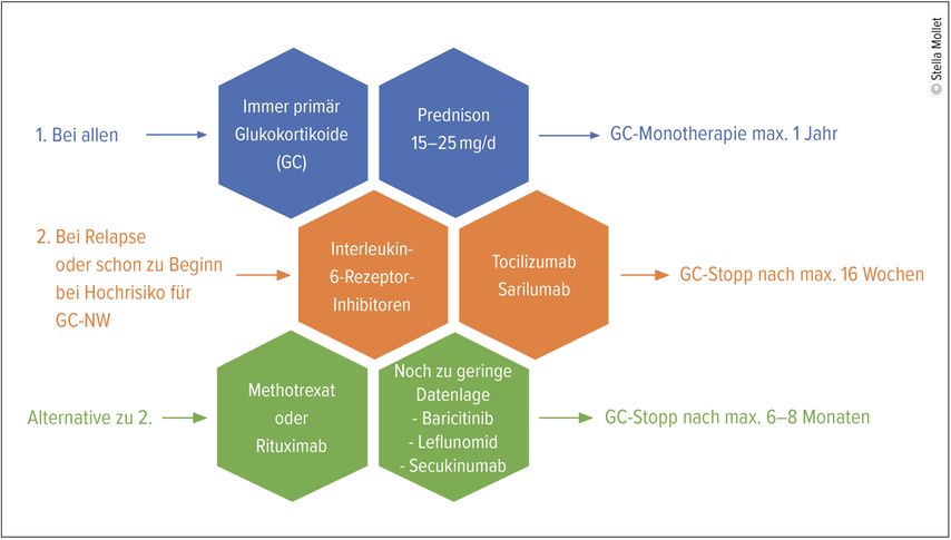 Als Glukokortikoid-sparende Medikamente kommen in erster Linie Interleukin-6-Rezeptor-Antagonisten, alternativ Methotrexat oder Rituximab zum Einsatz.