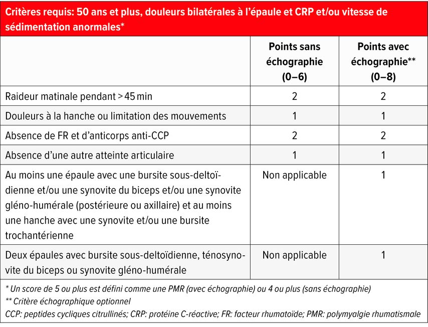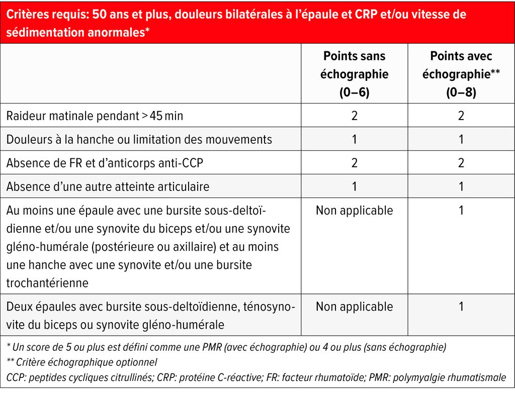 L’European Alliance of Associations for Rheumatology (EULAR) a établi en 2012 des critères de classification3, qui incluent ces caractéristiques clés (Tab.1). Outre ces dernières, des points sont également attribués en cas d’absence de facteur rhumatoïde et d’anticorps anti-CCP, ainsi qu’en l’absence d’autres douleurs articulaires. Il convient toutefois de noter qu’il s’agit de critères de classification généralement utilisés dans les études pour l’inclusion de participant·es. Il ne s’agit pas de critères diagnostiques permettant de poser un diagnostic au sens d’une liste de contrôle lorsque les critères sont remplis. La sensibilité de 68% et la spécificité de 78% sont donc plutôt faibles. L’ajout d’une échographie des épaules et des hanches n’a qu’une influence minime sur la sensibilité (66%) et la spécificité (81%). Les signes typiques d’une PMR à l’échographie sont une bursite sous-deltoïdienne généralement bilatérale, une ténosynovite du biceps en cas de synovite gléno-humérale, ainsi qu’une bursite trochantérienne ou une synovite fémoro-acétabulaire au niveau de l’articulation de la hanche.