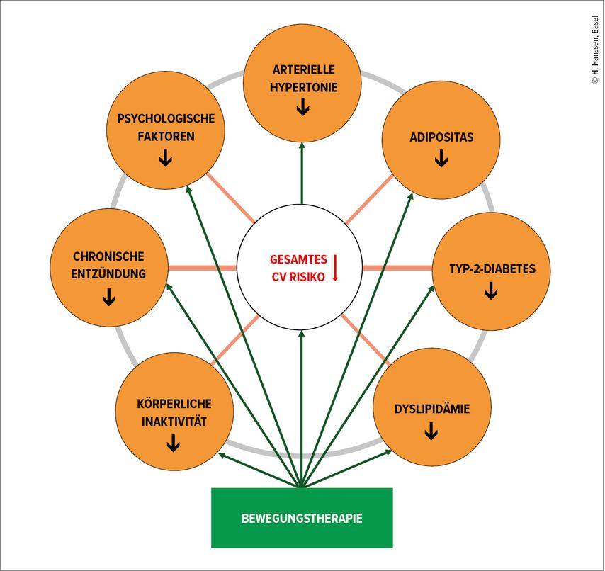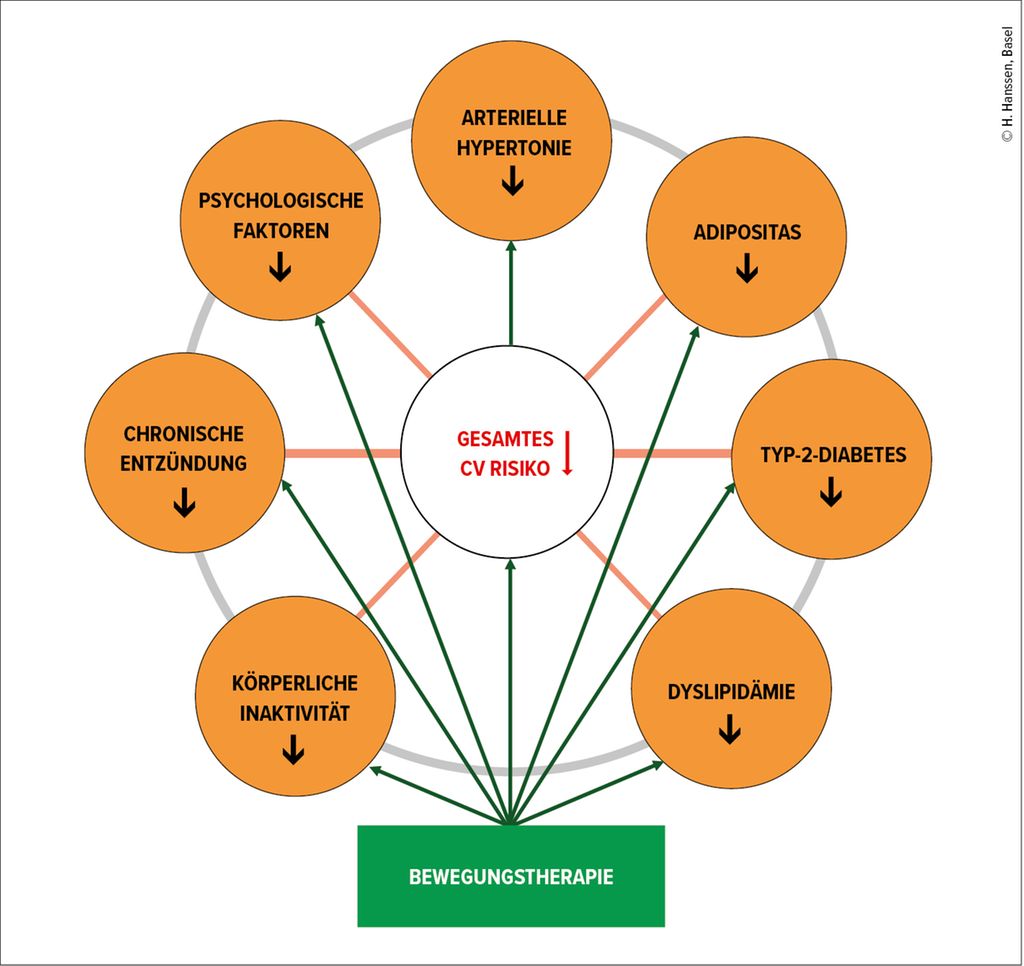 Die präventive und therapeutische Wirkung der Bewegungstherapie ist breit ausgelegt. Geringe körperliche Fitness dagegen hat einen stärkeren prognostischen Wert für kardiovaskuläre Mortalität als Risikofaktoren wie Rauchen, Diabetes mellitus, arterielle Hypertonie oder ein erhöhter Bauchumfang.2 Die Wichtigkeit einer regelmässigen körperlichen Aktivität in der Prävention sowie der Therapie ist klar gegeben. Gerade in der medizinischen Grundversorgung ermöglicht dies eine wichtige Chance: Sport kann und soll verordnet werden. Abbildung 1 stellt die Wirkung von Sport und Bewegung als «Polypille» auf die wesentlichen kardiovaskulären Risikofaktoren bildlich dar. Im Folgenden werden die Präventions- und Therapieansätze durch Bewegungstherapie bei kardiometabolischen Erkrankungen im Kontext der aktuellen Richtlinien und Expertenempfehlungen präsentiert.