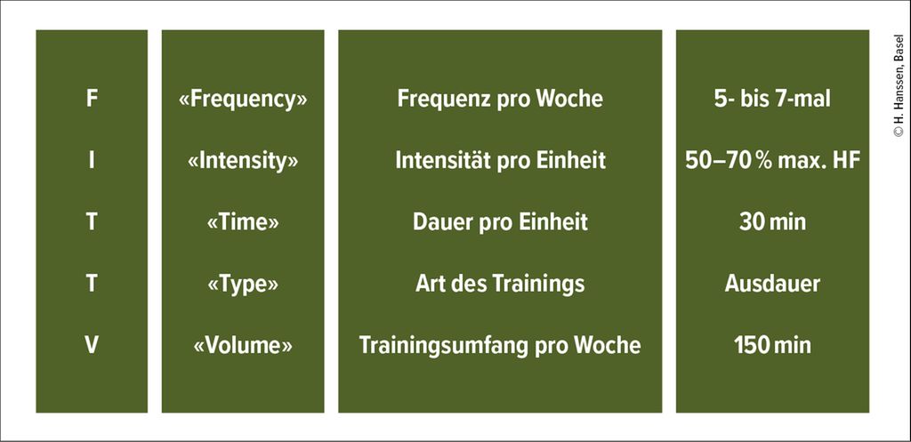 Patient:innen nur auf ihre körperliche Aktivität anzusprechen, führt erwiesenermassen bereits zu einer Steigerung ihrer Aktivität.1 Hierfür bietet sich das «Ask-Assess-Advice»-Schema an. Um einen Schritt weiterzugehen und eine Bewegungstherapie erfolgreich zu verschreiben, empfiehlt sich das FITT(V)-Prinzip (Abb.2). Mit Frequenz (F), Intensität (I), Dauer (T), Typ (T) und Volumen (V) werden so die Rahmenbedingungen des Trainings etabliert. Eine Frequenz (F) von 5- bis 7-mal in der Woche gilt als optimal. Für die Intensität (I) gibt es ein Optimum, das sich im moderaten bis leicht anstrengenden Bereich (60–75% der maximalen Herzfrequenz) befindet. Die Dauer (T) beträgt idealerweise 30min pro Tag, was in einem wöchentlichen Ziel von 150min resultiert. Darüber hinaus sollte zusätzlich noch Krafttraining 2- bis 3-mal in der Woche mit 50% bis max. 70% des 1-Wiederholungsmaximums für 3 Sets à 15 Wiederholungen der sechs grösseren Muskelgruppen im Sinne eines Kraft-Ausdauertrainings durchgeführt werden. Eine allmähliche Steigerung des Trainingsvolumens soll dazu dienen, auf die Patienten:innen nicht abschreckend zu wirken. So können anfangs beispielsweise dreimal in der Woche 15min verschrieben werden, je nach Ausgangslage der individuellen Person. In einem nächsten Schritt können dann die Frequenz oder die Dauer gesteigert werden. Eine Steigerung der Intensität sollte als Letztes erfolgen. Zusätzlich soll im Alltag darauf geachtet werden, längere Episoden von Inaktivität zu meiden. Während des gesamten Prozesses soll die Entscheidungsfindung gemeinsam stattfinden («shared decision making»), da die Motivation der Patient:innen essenziell ist für den Erfolg der Lebensstilveränderung. Die Auswahl des Programms soll demnach die Präferenzen und Umsetzbarkeit der Patient:innen adressieren («patient-centered care»).