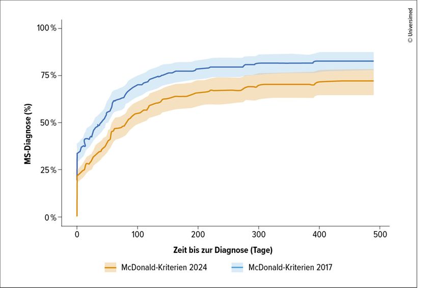 Eine spanische Studie verglich zu der Frage nach den praktischen Auswirkungen der Revision insgesamt 326 Patient:innen (im Mittel 39,0 Jahre, 67,5% Frauen) eines MS-Zentrums in Barcelona mit einer MS-Diagnose gemäss den McDonald-Kriterien 2024 und 2017. Patient:innen, welche die Kriterien 2024erfüllten, hatten eine um 43% höhere Wahrscheinlichkeit einer MS-Diagnose als nach den Kriterien von 2017 (Hazard-Ratio [HR]: 1,43; p<0,001) und wurden früher diagnostiziert (Zeit bis zur Diagnose: 4,1 versus 9,4 Monate).4
