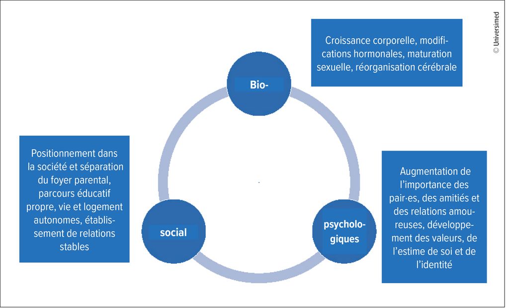 Elles comprennent, d’une part, des tâches de développement concernant la personne elle-même: p.ex. développer la confiance en soi, accepter les changements corporels liés à la puberté, gagner en autonomie décisionnelle, trouver et appliquer ses propres repères de valeur. D’autre part, elles concernent les relations sociales: p.ex. établir des contacts avec des pair·es, disposer d’un cercle d’ami·es stable, développer des relations intimes, se détacher du cadre familial, acquérir des compétences sociales et apprendre les règles d’un comportement équitable. Troisièmement, il s’agit également de tâches de développement relevant des structures sociales: p.ex. achever le parcours scolaire, choisir une profession et viser l’indépendance économique, clarifier les responsabilités liées au mode de vie et à la famille, développer sa propre orientation de valeurs et participer à la société. La réalisation de ces tâches est déterminante pour le développement de l’identité, l’intégration sociale et la réussite du passage à l’âge adulte.