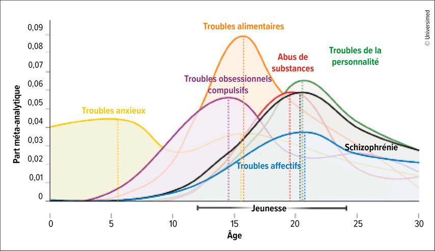 Fig. 1: Âge de survenue initiale des troubles psychiatriques (modifiée selon Uhlhaas PJ et al.: Mol Psychiatry 2023; 28: 3171-81, Fig.1)