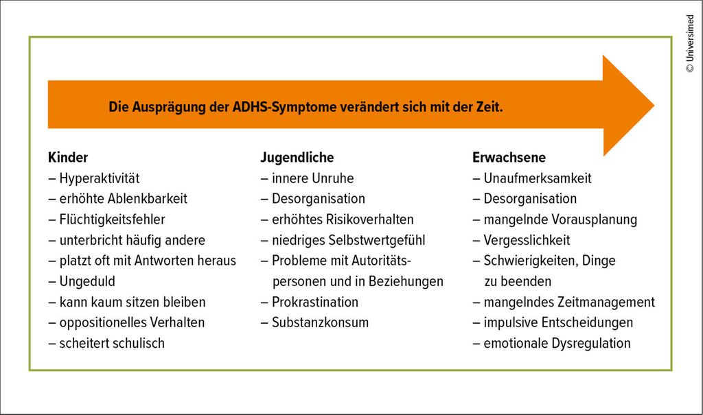 ADHS kann als Exempel einer Entwicklungsstörung angesehen werden. So wird die ADHS in ICD-11 auch als «neurodevelopmental disorders» klassifiziert. Die Prävalenz von ADHS liegt im Kindes- und Jugendalter bei etwa 5,9%, im Erwachsenenalter sinkt sie auf rund 2,5%. Dabei zeigen sich jedoch sehr unterschiedliche Entwicklungsverläufe, die meist auch mit einem Wandel der Symptomatik einhergehen. Auch die Kernsymptomatik – motorische Hyperaktivität, Impulsivität und Aufmerksamkeitsstörungen – verändert sich über die Zeit. Während bei Kindern meist die motorische Unruhe bzw. alle drei Kernsymptome gleichzeitig dominieren, wandelt sich dieses Bild bei Erwachsenen. Insbesondere bei Personen mit guter Introspektionsfähigkeit und hohen kognitiven Ressourcen wandelt es sich eher in ein Erleben innerer Unruhe oder eines ständigen «Getriebenseins». Die Aufmerksamkeitsspanne nimmt mit dem Alter zwar generell zu, bleibt bei Erwachsenen mit ADHS im Vergleich zu Gleichaltrigen jedoch eingeschränkt. Die Impulsivität geht im Verlauf meist zurück, da Kontrollmechanismen mit der Reifung stärker ausgebildet werden. Demgegenüber können emotionale Instabilität und Stimmungsschwankungen an Bedeutung gewinnen. In der Transition werden bei einer ADHS die Komorbiditäten hochrelevant. Häufig sind es diese, die dann die Therapieschwerpunkte bestimmen und auch die Lebensqualität der Betroffenen beeinträchtigen.