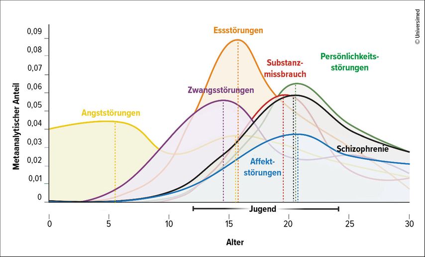 Abb. 1: Ersterkrankungsalter bei psychiatrischen Störungsbildern (angelehnt an Uhlhaas PJ et al.: Mol Psychiatry 2023; 28: 3171-81, Fig. 1)