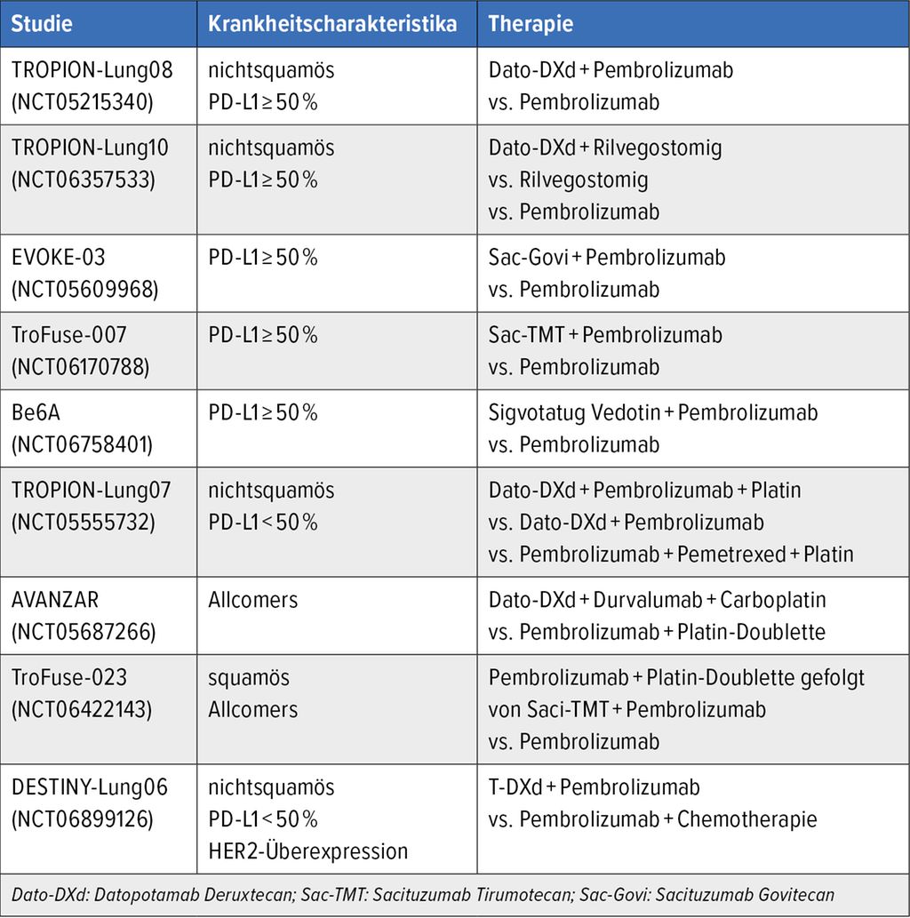 Mehrere Phase-I/II-Studien testeten Erstlinienkombinationen von ADC mit Chemotherapie, Immuntherapie oder beiden Ansätzen, beispielsweise TROPION-Lung02, TROPION-Lung04 mit Dato-DXd oder EVOKE-02 mit Saci-Govitecan. Sowohl die Doublette als auch die Triplette bewirkten anhaltende Antitumoraktivität, jedoch auch substanzielle Raten an unerwünschten Arzeneimittelwirkungen.10 Derzeit evaluiert eine Reihe von Phase-III-Studien Kombinationen aus ADC und Immuncheckpoint-Inhibitoren in der Erstlinie beim metastasierten NSCLC mit hoher PD-L1-Expression (≥50%), PD-L1<50% und Allcomers (Tab. 1).