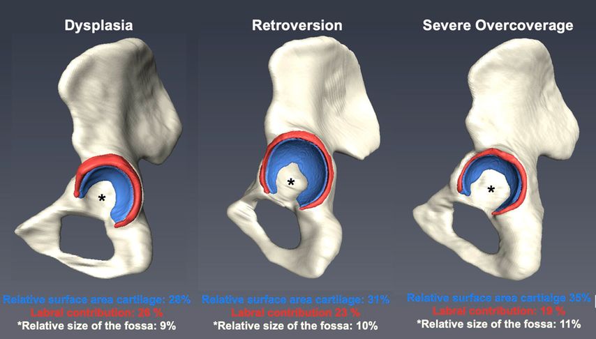 Fig. 4: Demonstrated are 3D models of pelvic bone with cartilage (blue) and labrum (red) of three different hip pathologies. Relative surface area of cartilage and the fossa is defined as the absolute surface area of cartilage divided by the absolute surface area of the femoral head. Labral contribution is defined as the absolute surface area of the labrum divided by the surface area of the joint contact surface (surface area labrum + cartilage)