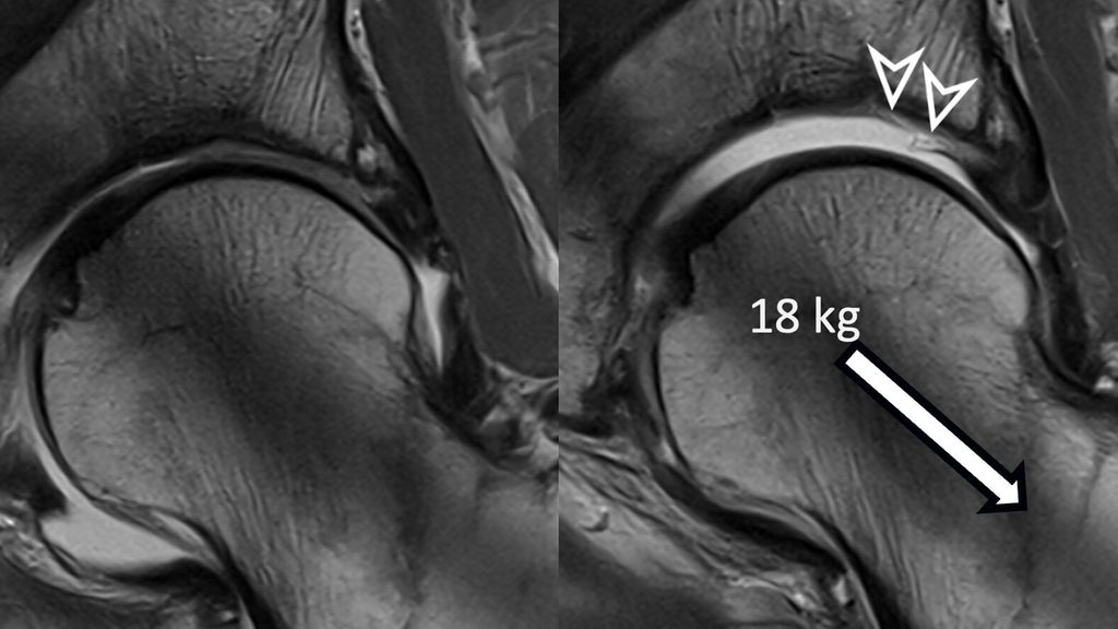 Fig. 1: Traction MR arthrography allows for better visualization of the opposing acetabular and