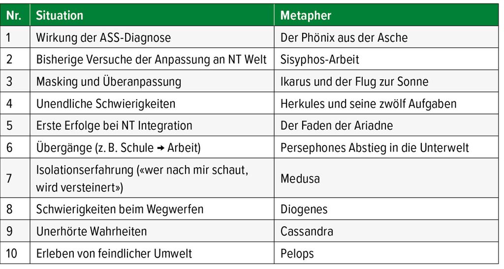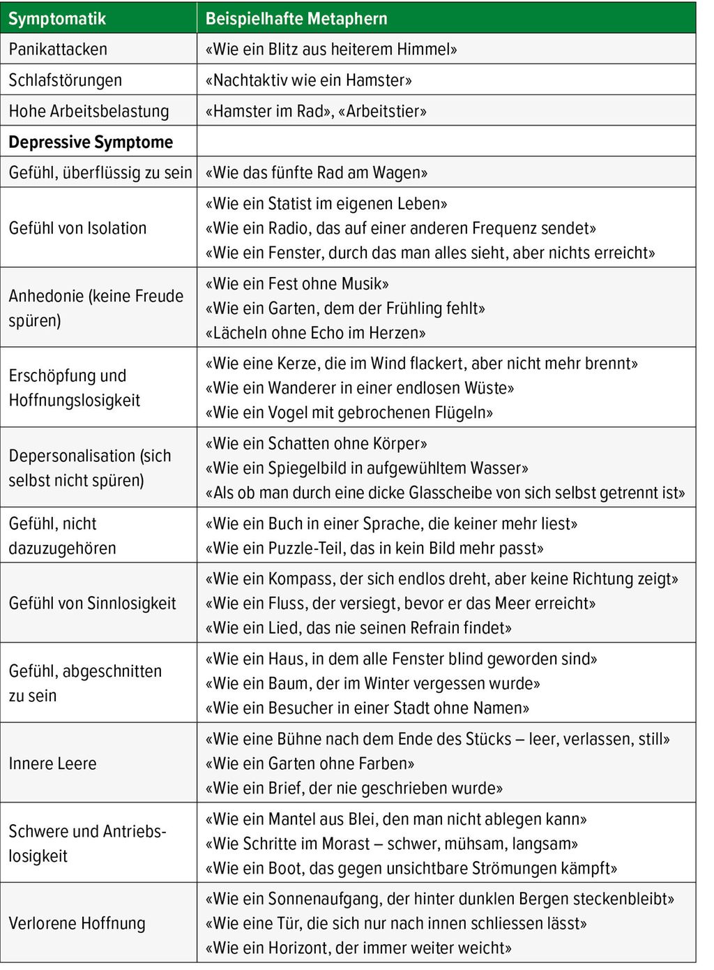 Beispielsweise kann das Bild eines «verrauschten Radiosenders» für die Beschreibung innerer Zustände stehen, wenn Gespräche unverständlich erscheinen, oder das Gefühl, «einen unsichtbaren Gesprächsleitfaden nicht erhalten zu haben», kann Ausdruck von Unsicherheit in sozialen Situationen sein. Solche metaphorischen Bilder eröffnen neue Ausdrucks- und Verstehensräume, die eine individuellere therapeutische Begleitung ermöglichen.