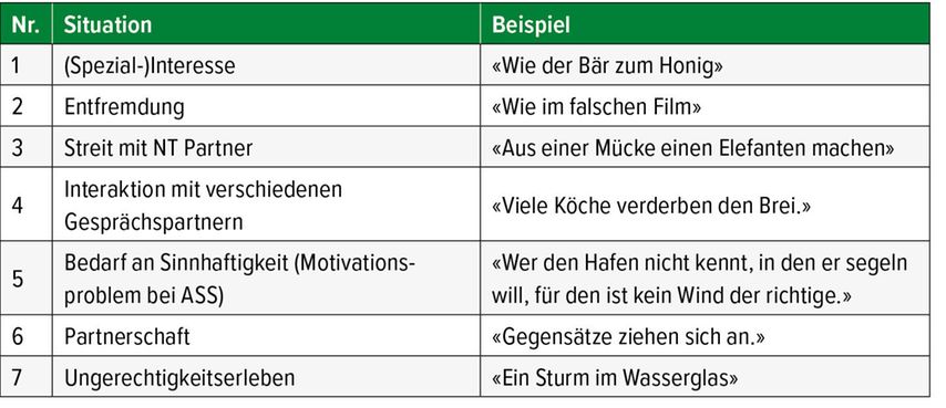 Das Gleiche gilt für das sprachlich veranschaulichende Bild, sei es eine Metapher, eine Redewendung, ein Spruch. Während neurotypische Klient:innen intuitiv die emotionale Bedeutung von Metaphern oder Redewendungen erfassen und sich verstanden fühlen, erleben ASS-Betroffene solche Äusserungen oft als konkrete, aber unpassende Zuschreibungen («Ich würde nie eine Henne melken – ich hasse Vögel!»). Auch der Versuch, durch eine veränderte Sprachmelodie, einen Wechsel des Gesprächstempos oder symbolische Wendungen wie «Es ist Schnee von gestern» Anschluss zu schaffen, stösst häufig auf sachliche Korrekturen oder Rückzug ins Konkrete. Es ist sinnvoll, bereits im Erstgespräch gezielte Interventionen zu setzen: Beispielsweise können insgesamt 6 Beispiele, Metaphern oder Redewendungen gezielt in das Gespräch eingebaut werden, um das Sprachverständnis auf metakommunikativer Ebene zu explorieren. Wird die Bedeutung erkannt, verallgemeinert oder sogar in einen emotionalen Kontext gestellt – oder bleibt die Person im konkreten Bezug zur eigenen Realität verhaftet?