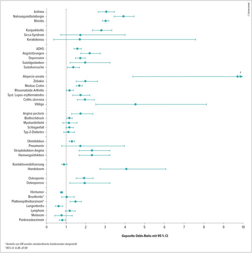 Abb. 1: Risiko von Komorbiditäten bei Patienten mit AD, abgeleitet von Daten aus Metaanalysen (modifiziert nach Thyssen JP et al. 2023)2