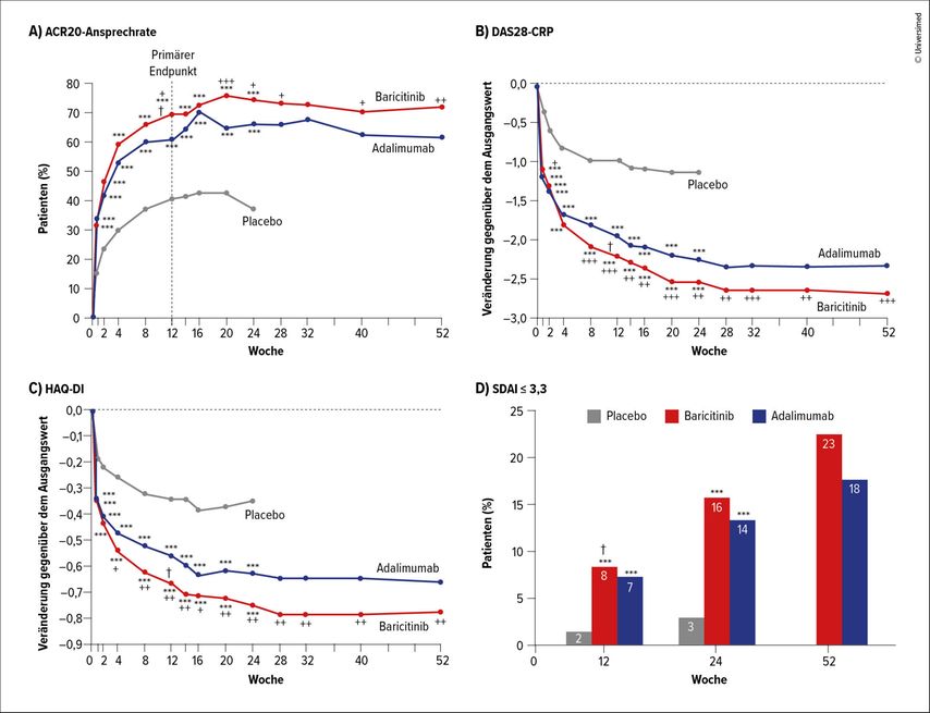 Abb. 1: A) Prozentsatz der Patienten, die gemäss den Kriterien des American College of Rheumatology (ACR20-Ansprechen) eine 20-prozentige Verbesserung aufwiesen. B) Veränderung des 28-Gelenk-Krankheitsaktivitäts-Scores (DAS28-CRP). C) LSM-Veränderung im «Health Assessment Questionnaire-Disability Index»(HAQ-DI)-Score, Verbesserung bei negativen Werten gegenüber dem Ausgangswert. D) Prozentsatz der Patienten mit einem «Simplified Disease Activity Index»(SDAI)-Score von 3,3 oder weniger (höhere Werte entsprechen grösserer Krankheitsaktivität, Werte ≤3,3 einer Remission)4