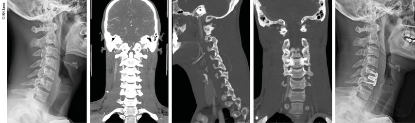 Abb. 3: Mann, 30a, Z.n. Snowboardsturz, Rotations-/Subluxationsverletzung C5/6 mit Dissektion der A. vertebralis r.; Zervikobrachialgie mit sensiblem Defizit; OP unter Heparintherapie, APT für 3 Monate