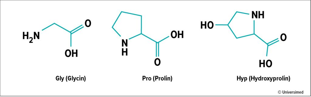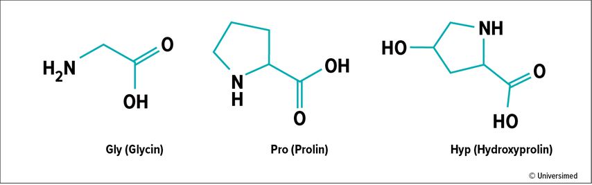 Da Kollagen ein Protein ist, besteht es aus Aminosäuren und besitzt eine typische Dreifachhelixkonfiguration, die aus jeweils drei Polypeptid-alpha-Ketten zusammengesetzt ist. Ein Kollagenpeptid kann aus bis zu 6000 Aminosäuren aufgebaut sein und stellt somit ein riesiges Molekül dar. Die Aminosäurenzusammensetzung folgt dem Schema G-X-Y und wiederholt sich ständig. Die Stelle G ist immer mit Glycin besetzt, an Stelle X findet sich meist Prolin und an der Stelle Y sieht man häufig ein Hydroxyprolin. Außerdem kommt die Aminosäure Lysin in hydroxylierter Form oft in den Peptidketten des Kollagens vor. Um das sogenannte Tropokollagen, das nach Abspaltung der Peptidenden des Prokollagens außerhalb der synthetisierenden Zelle entsteht, zu erhalten, werden jeweils drei Kollagenpeptide, die selbst schraubenförmig verdreht vorliegen, ineinander zu einer Helix verdrillt. Mehrere Tropokollagenelemente lagern sich dann zu Kollagenfibrillen zusammen und bilden schließlich dicke Kollagenfasern. Kollagenfibrillen können sich, je nach Funktion, parallel oder flächig ausrichten. Kollagenfasern werden durch die Ausbildung von Wasserstoffbrücken stabilisiert und leicht zueinander versetzt angeordnet.