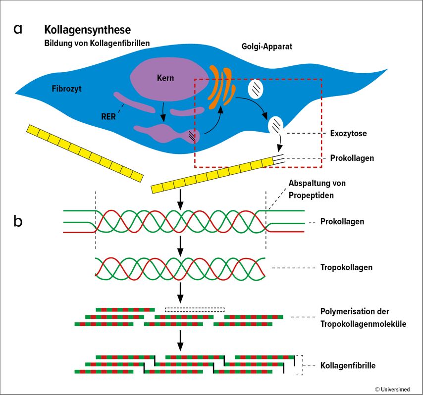 Für die körpereigene Synthese von Kollagen werden neben den schon oben erwähnten Aminosäuren Glycin, Prolin und Lysin unter anderem Vitamin C, Eisen, Kupfer, Vitamin A und Zink benötigt.